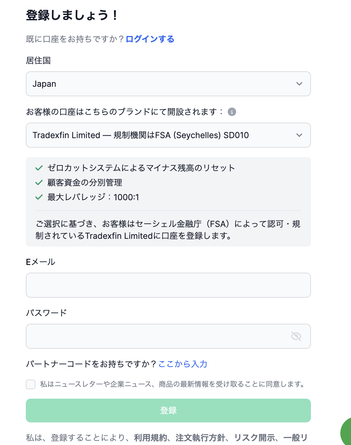 口座開設の最初のステップで「Tradexfin Limited (FSA)」と「Fintira Limited (FSC)」の選択肢が出てきます。
